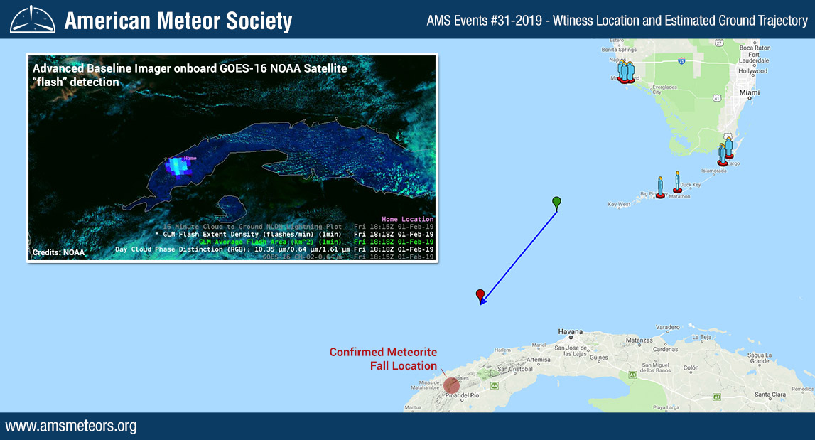 The map below shows the first estimated ground trajectory of the fireball obtained from these witness reports as well as an image obtained from the GOES-16 NOAA Satellite used for the detection of meteoroid impacts by Peter Jenniskens’ team (SETI Institute).