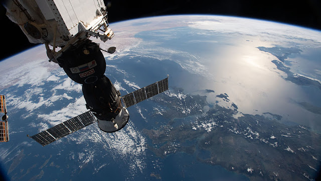 Image above: This view from the International Space Station looks from northeast to southwest, from Greece, Italy and across the Mediterranean Sea to Libya. The Soyuz MS-12 spacecraft is pictured in the foreground. Image Credit: NASA.